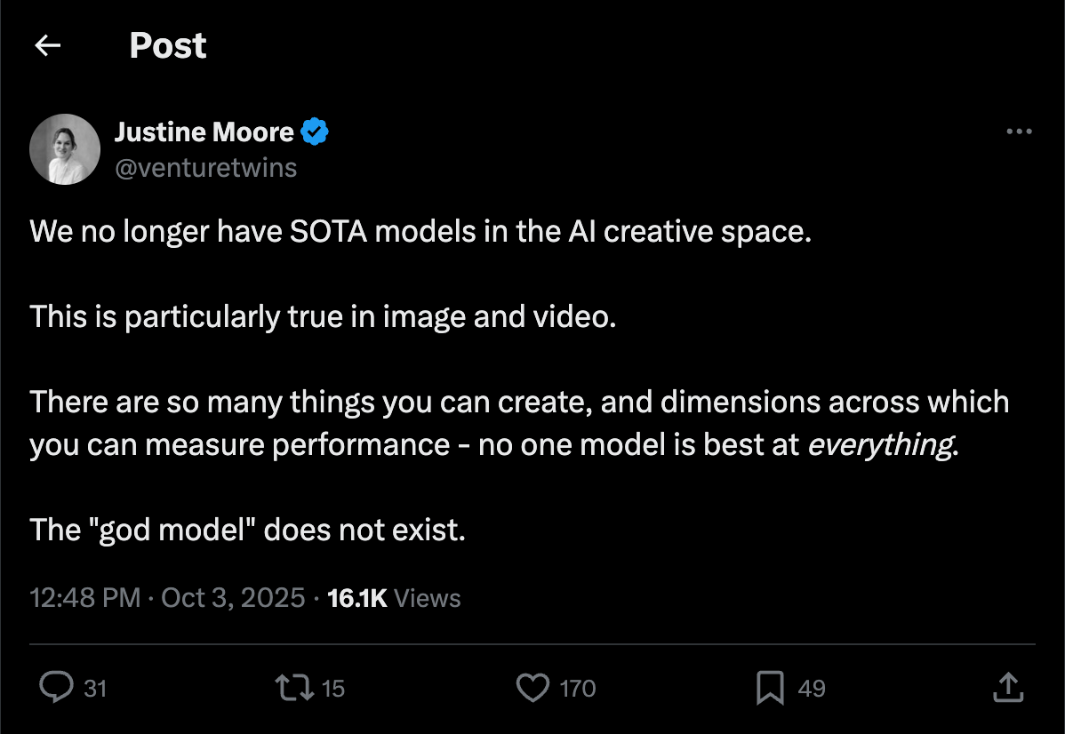 For the past few years, frontier diffusion model labs have consistently released models that outperform prior generations on major benchmarks. This progress inculcated an assumption among researchers, creators, and (yes) VC’s like myself: a “god-tier” model that is great at everything would eventually emerge, and become the default provider for a multitude of different video use-cases. But this year, the assumption was challenged: Sora 2 was released last month, and appeared below Veo 3 on benchmarks like LMarena. There’s a sense that progress might be slowing on the diffusion model level, and the concept of “SOTA”, at least when it comes to video models, may not actually exist.